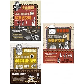 本套書共有三冊:《【漫畫圖解】不可思議的埃及古文明》、《【漫畫圖解】不可思議的希臘神話、歷史》、《【漫畫圖解】不可思議的馬雅古文明(還有阿茲特克)》
