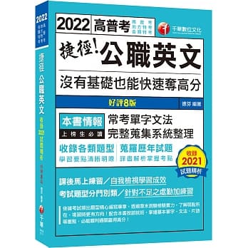 依據考試題型分列各個主題詳述,將考試重點詳細說明,並配合表格統整字首、字根、字尾的分類規則,以及易混淆相似字比一比,文法也分八大詞類、句型詳細剖析,會話、綜合測驗、閱讀測驗也列舉了情境式主題來練習。版面呈現清楚、美觀,藉由熟讀本書,讓你在高、普考等各類特考都能夠輕鬆應對,主題式的重點整理,高分上榜的最佳利器!