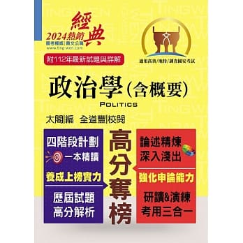PART1-內容精要,本書將政治學重點共分為五篇16章,依照命題大綱及趨勢進行編修,透過政治理論精析、實務制度分析及相關學說的整理,協助您釐清理論與實務之關係,建立思想脈絡與架構。作者參考數十位高分上榜考生之意見,建立「一本精讀」的內文體系,透過「一本精讀」的內文編排,協助考生研讀時能夠即時掌握命題焦點與趨勢,知己知彼自能無往不利,每章後面附有階段性試題演練,協助讀者檢視自己對於章節內容的吸收程度!