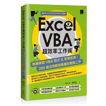 即使你從未學習過程式設計,也沒有問題,請放心翻閱本書。透過步驟式教學的清楚指示,將可使你了解VBA程式的基礎知識,同時可套用200個範例,逐步熟悉VBA程式的功能特質。隨著基礎的逐漸累積後,你便可以進一步挑戰製作複雜的VBA程式。本書可快速讓你融入VBA的世界,對於想在短時間之內學會Excel VBA程式設計的人而言,可說是最佳的學習教材。