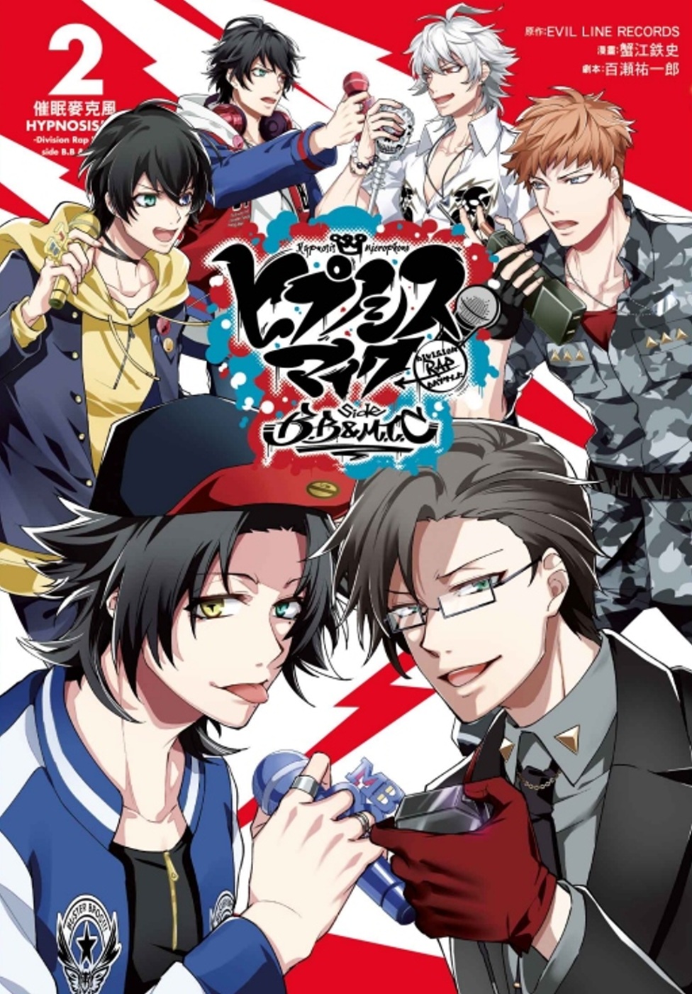 地區饒舌對戰預賽終於開始。「Buster Bros!!!」的二郎和三郎步調不一,被迫陷入苦戰。一郎暗示可能會解散隊伍,心生動搖的兩人中了對戰隊伍的策略!!另一方面,「MAD TRIGGER CREW」也一樣,理鶯軍人時代的前同事.頸木的登場,擾亂了隊伍。在和宿敵對決前,危機造訪兩隊──!!揭露在原作當中沒有描寫到的,對戰的後台以及衝擊的過去,「催眠麥克風」改編漫畫第2集!