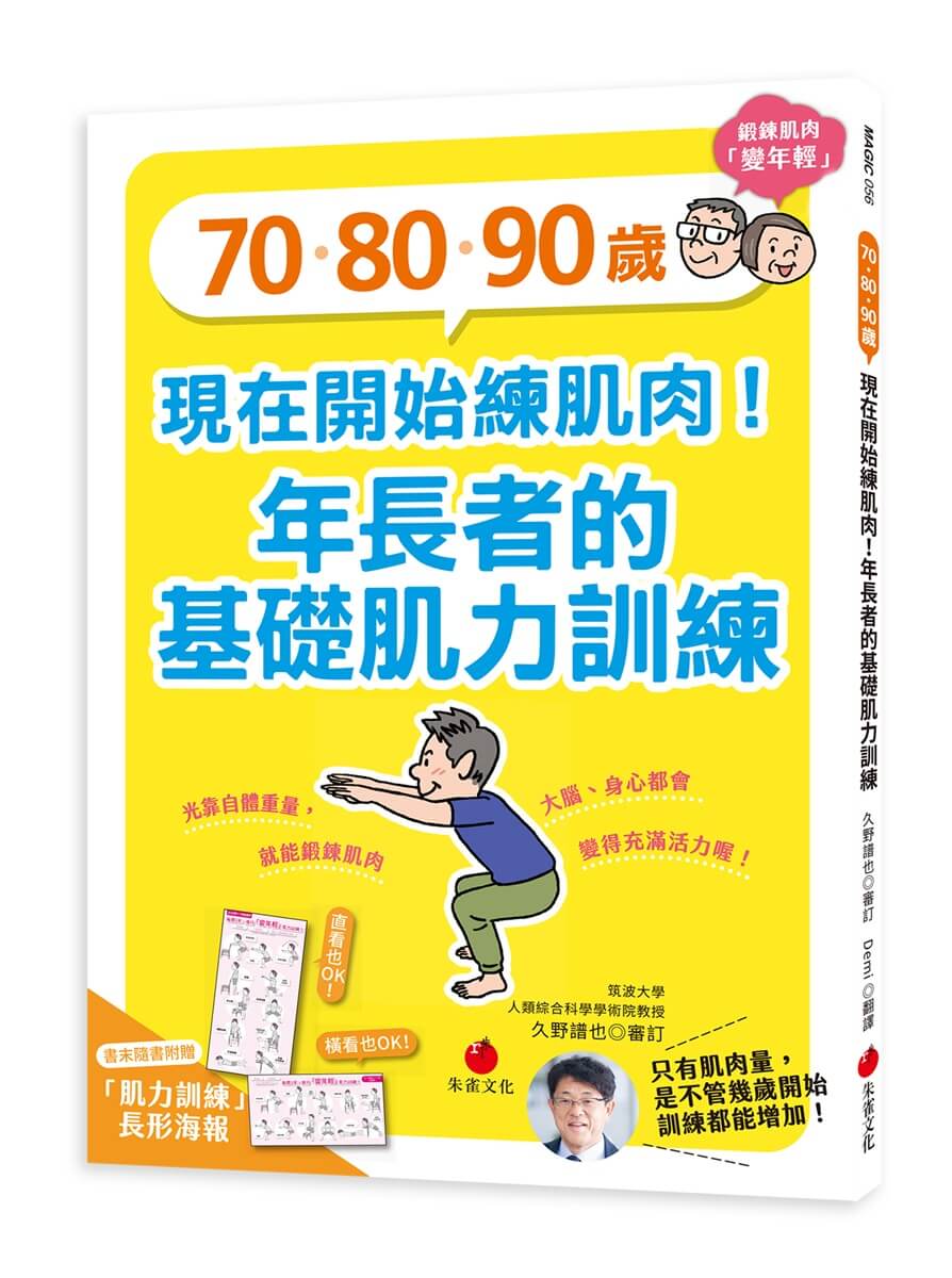 此外,為了讓年長者的肌力訓練發揮最大的效果,提供走路等有氧運動、飲食營養相關知識搭配。書末附有可自行複印不限次數使用的「肌力訓練記錄」表格,每天詳細記錄不遺漏,以及「肌力訓練」雙面長形海報,裁剪後貼在家中適當位置,無論想直貼,或者是橫貼都清楚明顯。不用器械,不上健身房,光靠自體重量在家就能鍛鍊肌力。