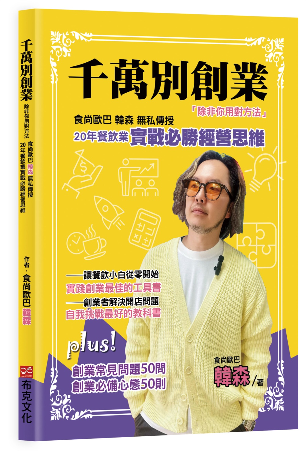 大家好,我是食尚歐巴—韓森老師(以下稱歐巴),從事餐飲業已經超過20年的時間,畢業後第一份工作就是當老闆,20多年來也一直在餐飲相關的領域打拼從沒離開過,創業期間經歷過創業初期的撞牆期,金融海嘯,毒奶精塑化劑事件,SARS,英國藍茶葉農藥超標事件,COVID-19等等考驗,在內外衝擊又艱困的餐飲市場下,還存活下來這1%打不死的蟑螂。我不敢說我是一位非常成功的創業者,但是我絕對是整個創業過程從無到有親身經歷過程的實踐者。這本書我將帶領大家分享我這20年來的創業歷程,在過程中分享實際經營餐飲的策略及方法、遇到瓶頸要如何處理與突破,以及是什麼樣的思維模式與心態才能成為一個成功的創業者。