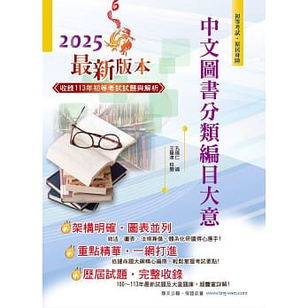 篇目包含有:「資訊組織概論」、「編目法」、「分類法」、「標題法」、「目錄排列法」、「中文圖書分類編目趨勢」等,均為中文圖書分類編目大意考試粹選之精華,可迅速提升考生實力。
