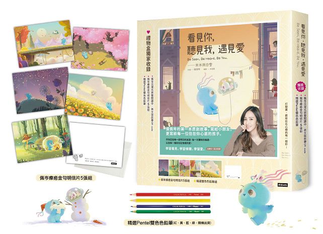 看見你,聽見我,遇見愛:米米與白雪(全書中、英對照精裝版繪本故事+佩岑沉浸式原聲閱讀中、英文版故事QR Code+ Pentel雙色色鉛筆+佩岑療癒金句原創圖明信片一套共5張)