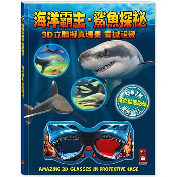 附有3D立體鯊魚眼鏡,搭配書中擬真場景與鯊魚圖片,從中了解鯊魚習性、特徵,探索海底世界。