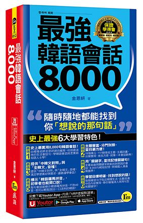 《最強韓語會話8,000》精選收錄內容最完整的韓語會話句。遇到臨時需要開口的時刻別慌張,隨翻隨找,都能馬上找到你想要說的那一句。一書在手,讓你遇到韓國人時,能完整表達、決不再詞窮。
