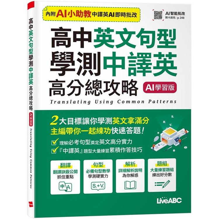 說到中譯英,除了具備足夠的英文字彙量及了解英文文法,能夠掌握作為句子架構的「句型」也是相當重要的一環。因此,我們參考高中英文教材,精選當中最常派上用場或大考出題率較高的英文句型,並以中文為切入點,從「這句中文怎麼翻?」出發,提示翻譯所需的步驟,一步一步引導讀者將中文句子翻成正確且通順的英文句子。在每個單元末的練習「小試身手」中,我們提供了基礎的翻譯填空練習及進階的整句式翻譯,讀者可登入LiveABC AI數位學習網,透過AI 小助教的批改功能驗收學習成果。