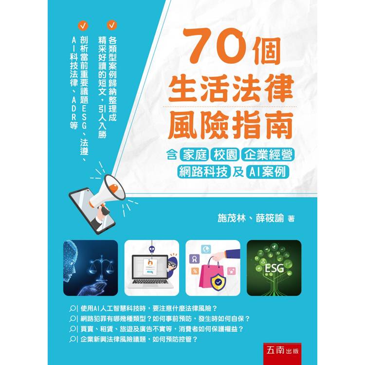 有鑑於近年新聞報導,例如:遺囑無效、弱勢保護、股東權益、企業風險、電子商務、資安管理、新科技AI人工智慧衍生的問題等,一般大眾遇到其法律風險時,常不知如何正確應對處理,本書採實用的案例文章,以70個各類生活的風險案例,搭配智慧小撇步,讓讀者們輕鬆看、快樂學、巧思考,閱後容易融會貫通,擴展法律視野,具備跨領域整合能力。