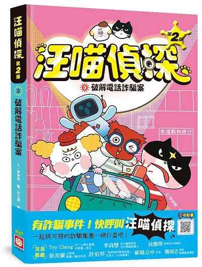 汪喵偵探是否能順利抓住所有詐騙集團成員,將壞蛋們一網打盡呢?現在就翻開書本,努力找出所有線索,跟著汪喵偵探一起破解案件,解除動物小鎮居民的詐騙危機!